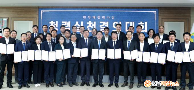 Àü³²µµ´Â Åõ¸íÇϰí û·ÅÇÑ °øÁ÷»çȸ Á¶¼ºÀ» À§ÇØ ¡ã°íÀ§Á÷ ÁÖµµÀÇ Ã»·ÅÇÑ °øÁ÷¹®È È®»ê ¡ã³»ºÎü°¨µµ Çâ»óÀ» À§ÇÑ ¼ÒÅ롤°ø°¨ Á¶Á÷¹®È ±¸Ãà ¡ã¸ÂÃãÇü û·Å±³À° ½ÃÇà ¡ã°¢Á¾ ºñ¸® ¹× ºÎÆÐÇàÀ§ ±ÙÀýÀ» À§ÇÑ °øÀͽŰí ȯ°æ Á¶¼º ¡ãºÎÆÐ Ãë¾àºÐ¾ß ÁýÁß °ü¸® ¡ãû·Å½ÃÃ¥ ÃßÁøÀÇ °ø°¨´ë Çü¼º ¹× ½Å·Ú¼º È®º¸ µî 4°³ ºÐ¾ß 45°³ û·Å ½ÃÃ¥À» ÃßÁøÇØ µµ¹ÎÀÌ ½Å·ÚÇÏ´Â Àü³²µµ¸¦ ½ÇÇöÇϰí û·Åµµ ¿ì¼ö±â°üÀ¸·Î Àçµµ¾àÇÒ ¹æÄ§ÀÌ´Ù.