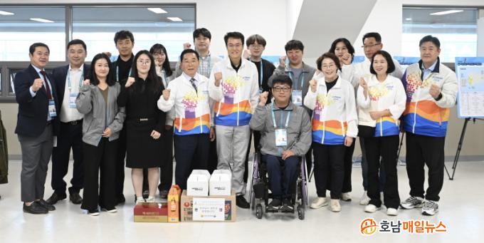 À̳¯ Àü³²µµ ÁÖ¼ø¼± °ü±¤Ã¼À°±¹Àå, ÀÌ»ó½É º¸°Çº¹Áö±¹Àå°ú ¹ÚÁ¤Çö Àü³²Àå¾ÖÀÎüÀ°È¸ »óÀÓºÎȸÀåÀº 17°³ ½Ã¡¤µµº° »óȲ½Ç¿¡ ¸ñÆ÷ÀÇ ÇØ»ê¹° °£½Ä¼¼Æ®, Á¦°ú»§, ÄŶó¸é µî Áö¿ª Ư»ê¹°·Î ±¸¼ºµÈ °£½Ä°ú ±â³äǰÀ» Àü´ÞÇß´Ù.