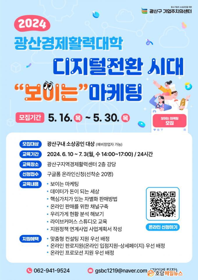 ±³À° Àå¼Ò´Â ±¤»ê±¸ Áö¿ª°æÁ¦È°·Â¼¾ÅÍ 2Ãþ °´çÀÌ´Ù. 1Â÷´Â ÀÌ´Þ 30ÀϱîÁö, 2Â÷´Â 6¿ù 14ÀϱîÁö °¢ 20¸íÀ» ¼±Âø¼øÀ¸·Î ±³À°»ýÀ» ¸ðÁýÇÑ´Ù. ½ÅûÀº ±¤»ê±¸ ±â¾÷ÁÖÄ¡ÀǼ¾ÅÍ ´©¸®Áý, È«º¸¹°¿¡ Àִ ť¾Æ¸£(QR) ÄÚµå µîÀ» ÅëÇØ ¿Â¶óÀÎÀ¸·Î Á¢¼öÇÑ´Ù.