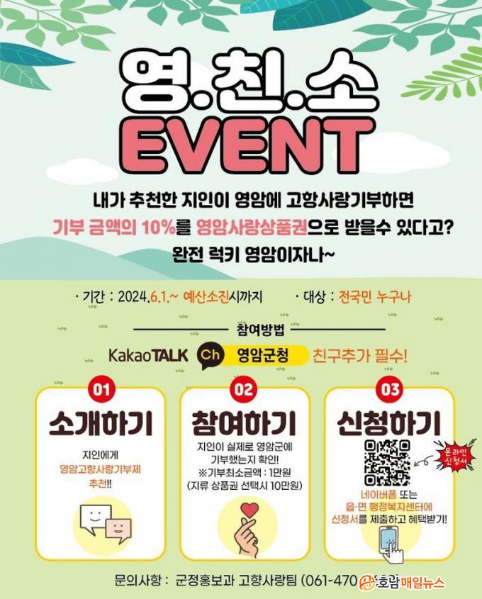 ¡®¿µ¾Ï °íÇâ»ç¶û±âºÎÁ¦¸¦ Ä£±¸¿¡°Ô ¼Ò°³ÇØ ÁÖ¼¼¿ä¡¯ÀÇ ÁÙÀÓ¸» ¡®¿µ¡¤Ä£¡¤¼Ò¡¯·Î ¸í¸íµÈ À̹ø À̺¥Æ®´Â, ³»°¡ ÃßõÇÑ ÁöÀÎÀÌ ¿µ¾Ï¿¡ °íÇâ»ç¶û±âºÎÇϸé, ±âºÎ ±Ý¾×ÀÇ 10%¸¦ ³ª¿¡°Ô ¿µ¾Ï»ç¶û»óǰ±ÇÀ¸·Î ¿µ¾Ï±ºÀÌ Áö±ÞÇØÁÖ´Â ³»¿ë.