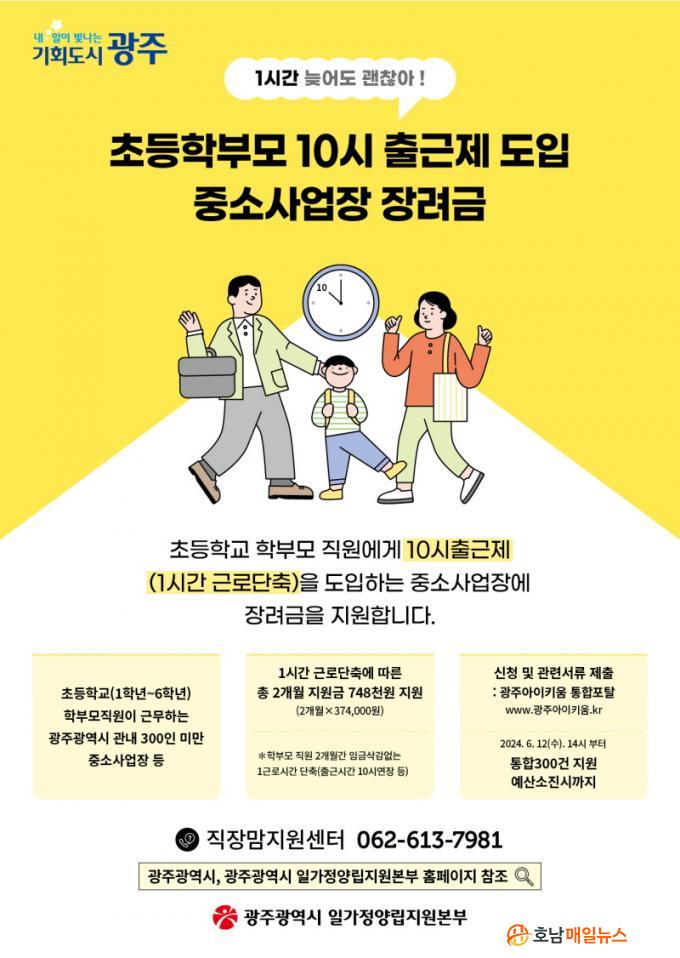 ÀÌ »ç¾÷Àº ±¤ÁÖÁö¿ª Áß¼Ò±â¾÷¿¡ ÀçÁ÷ÇÏ´Â Ãʵî Çкθð ±Ù·ÎÀÚ°¡ ÃÖ´ë 2°³¿ù °£ ÀÓ±Ý »è°¨ ¾øÀÌ ±Ù·Î½Ã°£ 1½Ã°£À» ´ÜÃàÇÒ ¼ö ÀÖ´Â Àϰ¡Á¤¾ç¸³ Áö¿ø »ç¾÷ÀÌ´Ù. ¿¹¸¦ µé¾î Ãâ±Ù½Ã°£À» ¿ÀÀü 9½Ã¿¡¼ 10½Ã·Î ´ÊÃ߰ųª, Åð±Ù½Ã°£À» ¿ÀÈÄ 6½Ã¿¡¼ 5½Ã·Î ¾Õ´ç±â´Â ¹æ½ÄÀÌ´Ù.