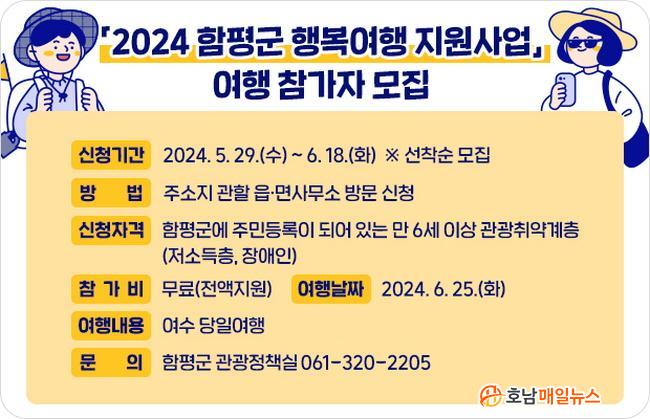 ¡®2024 ÇÔÆò±º Çູ¿©Çà Áö¿ø»ç¾÷¡¯Àº ½ÅüÀû¡¤°æÁ¦Àû ¿©°ÇÀ¸·Î °ü±¤È°µ¿ÀÌ ¾î·Á¿î Ãë¾à°èÃþ¿¡°Ô ¿©ÇàÀ» ¹«·á·Î Á¦°øÇÏ´Â ÇÁ·Î±×·¥ÀÌ´Ù. Àú¼ÒµæÃþ¿¡°Ô´Â 1Àδç 16¸¸¿ø, Àå¾ÖÀÎÀÇ °æ¿ì µ¿¹ÝÀÚ 1ÀÎÀ» Æ÷ÇÔÇØ 32¸¸¿ø »ó´çÀÇ ´çÀÏ ¿©Çà»óǰÀ» Áö¿øÇÑ´Ù.