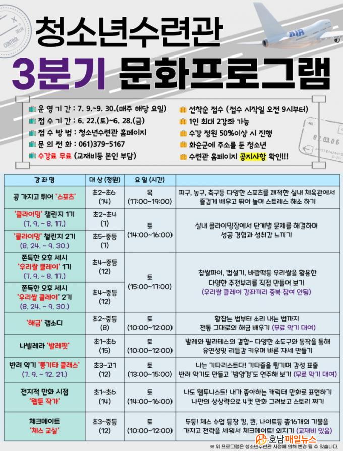 À̹ø °Á´ 2024³â 7¿ù 9ÀϺÎÅÍ 9¿ù 30ÀϱîÁö ¸ÅÁÖ ÇØ´ç ¿äÀÏ¿¡ ÁøÇàµÉ ¿¹Á¤À̰í Áö¿ø ´ë»óÀº ȼø±º¿¡ ÁÖ¼Ò¸¦ µÐ û¼Ò³âÀ¸·Î 6¿ù 22ÀÏ(Åä)~6¿ù 28ÀÏ(±Ý)±îÁö ȼø±ºÃ»¼Ò³â¼ö·Ã°ü ´©¸®Áý, ÇÁ·Î±×·¥ ½Åû °Ô½ÃÆÇ(https://hwasunyouth.kr)¿¡¼