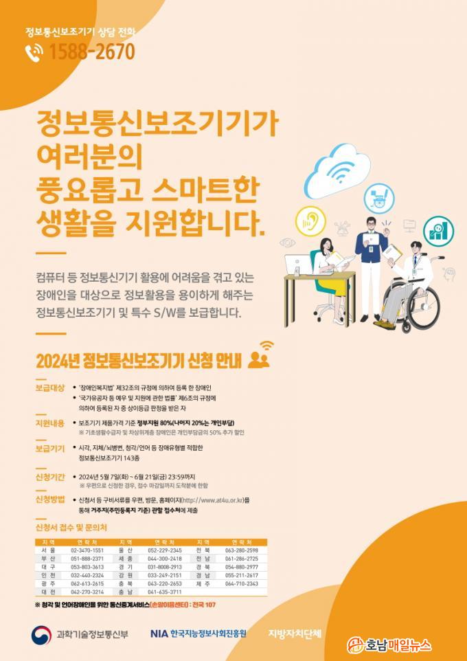 Àå¾ÖÀÎÀÌ Á¤º¸Åë½Å ±â¼ú¿¡ ½±°Ô Á¢±ÙÇϵµ·Ï Ư¼ö º¸Á¶±â±â¸¦ Àú·ÅÇÏ°Ô º¸±ÞÇÏ´Â Á¤º¸Åë½Åº¸Á¶±â±â º¸±Þ»ç¾÷Àº ÇöÀç Á¢¼ö¸¦ ÁøÇàÇϰí ÀÖ´Ù. Á¤º¸Åë½Åº¸Á¶±â±â ¿Â¶óÀÎ ½Åû ´©¸®Áý(www.at4u.or.kr)À̳ª ½Ã±º Á¤º¸È¾÷¹« ´ã´çºÎ¼¿¡ ¹æ¹®Çϰųª ÀüÀÚ¿ìÆíÀ¸·Î ¿À´Â 21ÀϱîÁö ½ÅûÇÏ¸é µÈ´Ù.