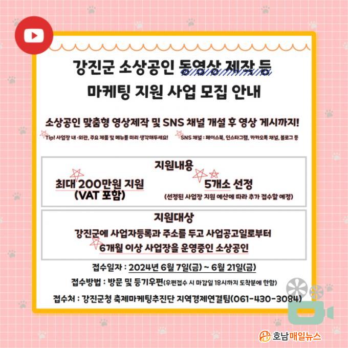 ÇØ´ç »ç¾÷Áö¿ø ´ë»óÀÚ´Â °Áø±º¿¡ »ç¾÷ÀÚµî·Ï°ú ÁÖ¼Ò¸¦ µÎ°í »ç¾÷ °ø°íÀϷκÎÅÍ 6°³¿ù ÀÌ»ó »ç¾÷ÀåÀ» ¿î¿µ ÁßÀÎ ¼Ò»ó°øÀÎÀ¸·Î µ¿¿µ»ó Á¦ÀÛ µî »ç¾÷ ÁøÇàÀ» À§ÇØ ¹ß»ýÇÏ´Â ºñ¿ëÀº °³¼Ò´ç ÃÖ´ë 200¸¸¿ø Çѵµ±îÁö Áö¿øÇϸç, ¼±Á¤µÈ ¾÷ü¿¡ ´ëÇÏ¿© ±º¿¡¼ Àϰý Á¦ÀÛÇØ ¹èÆ÷ÇÒ °èȹÀÌ´Ù.