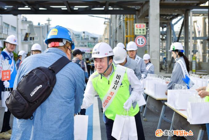 ƯÈ÷ ´ëÁ¤ºñ ±Ù·ÎÀÚ Ãâ±Ù½Ã°£¿¡ ¸ÂÃç ¾ÆÄ§ 7½Ã20ºÐºÎÅÍ ½ÃÀÛµÈ Ä·ÆäÀο¡¼ Âü¿©ÀÚµéÀº ±Ù·ÎÀÚ¿¡°Ô È«º¸¹°À» ¹èºÎÇÏ¸ç ¾ÈÀü±¸È£¸¦ Á¦Ã¢ÇÏ´Â µî »ç¾÷Àå ±Ù·ÎÀÚ ¾ÈÀüÀÇ½Ä °íÃë¿¡ Èû½è´Ù.
