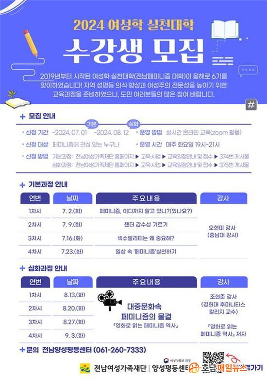 ±âº»°úÁ¤ Á¾·á ÈÄ ½ÉȰúÁ¤À¸·Î 8¿ù 13ÀϺÎÅÍ 9¿ù 3ÀϱîÁö ´ëÁß¹®È¸¦ Ȱ¿ëÇÑ 「¿µÈ·Î º¸´Â Æä¹Ì´ÏÁò」 °Á°¡ ÁøÇà µÉ ¿¹Á¤À̸ç, ¸¶Áö¸· Àü¹®°Á´ 9¿ù 24ÀϺÎÅÍ ÁøÇà ¿¹Á¤ÀÌ´Ù. ¼ö° ¹®ÀÇ´Â Àü³²¿©¼º°¡Á·Àç´Ü ¾ç¼ºÆòµî¼¾ÅÍ(061-260-7333)·Î ÇÏ¸é µÈ´Ù.