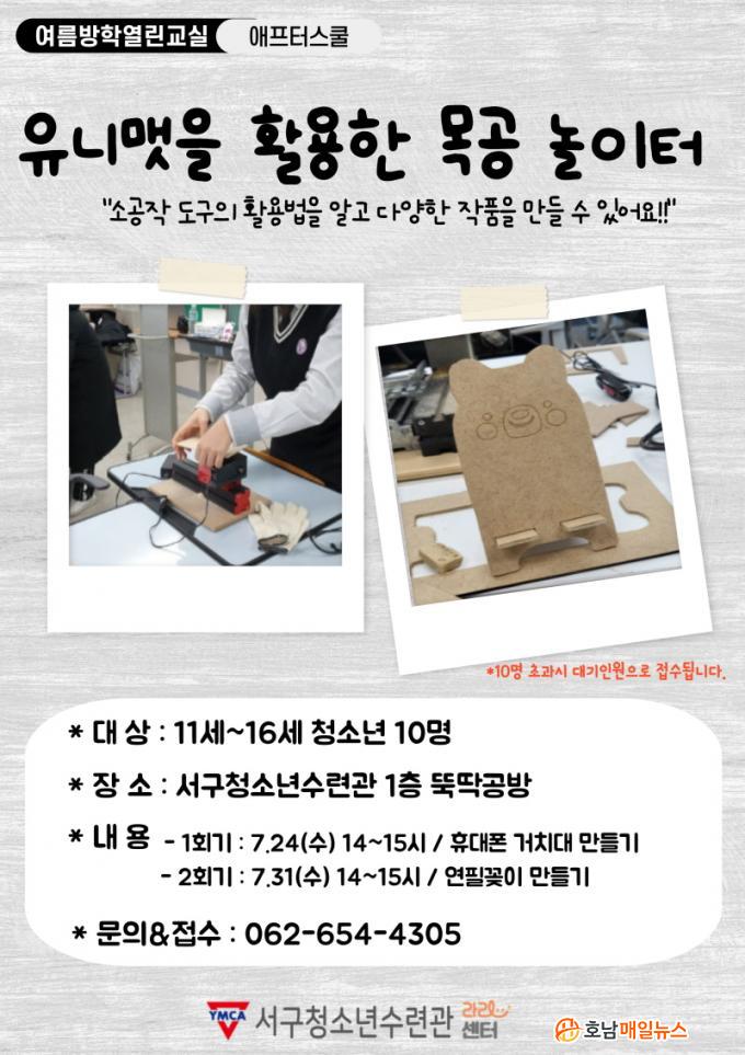 ¡®À¯´Ï¸ËÀ» Ȱ¿ëÇÑ ¸ñ°ø³îÀÌÅÍ¡¯´Â ÃÑ 2ȸ±â·Î ¡ãÈÞ´ëÆù °ÅÄ¡´ë ¸¸µé±â¡ã¿¬ÇʲÈÀÌ ¸¸µé±â·Î ÁøÇàµÈ´Ù. ÁøÇà±â°£Àº 7¿ù24ÀϺÎÅÍ 7¿ù31ÀϱîÁö¸ç, ¸ÅÁÖ ¼ö¿äÀÏ 14½ÃºÎÅÍ 15½Ã±îÁö ÁøÇàµÈ´Ù. ¸ðÁýÀοø 11¼¼¿¡¼ 16¼¼ û¼Ò³â 10¸íÀ̶ó°í ¹àÇû´Ù.
