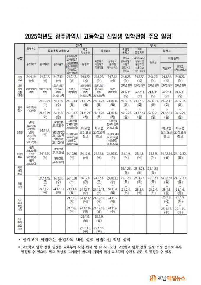 ¿ø¼Á¢¼ö ÀÏÁ¤°ú ÀϹݰè°í ÇÕ°ÝÀÚ ¹× ¹èÁ¤ °ü·Ã ³»¿ëµµ °ø°³µÆ´Ù. Ư¼ö¸ñÀû°íµîÇб³ÀÇ ¿ø¼Á¢¼ö´Â ¡ã»ê¾÷¼ö¿ä¸ÂÃãÇü°í ¸¶À̽ºÅͰí 2°³±³¿Í ±¤ÁÖÇü ¸¶À̽ºÅͰí 1°³±³ 10¿ù 14ÀÏ ¡ã±¤ÁÖüÀ°°í 10¿ù 23ÀÏ ¡ã±¤ÁÖ¿¹¼ú°í 11¿ù 6ÀÏ ½ÃÀÛÇÑ´Ù. ÀÌ¾î ¡ãÁ÷¾÷°è°í°¡ Áß½ÉÀÌ µÈ Ư¼ºÈ°íµîÇб³ 11°³±³ 11¿ù 25ÀÏ ¡ãÀÚÀ²Çü°ø¸³°í, °úÇÐÁßÁ¡°í¸¦ Æ÷ÇÔÇÑ ÆòÁØÈ ÀϹݰí 12¿ù 17ÀÏ ¼øÀÌ´Ù.
