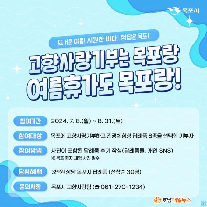 À̺¥Æ®´Â ±â°£ Áß ¼±Á¤Àοø 30¸í µµ´Þ±îÁö ÁøÇàµÇ¸ç, °ü±¤Ã¼ÇèÇü ´ä·Êǰ ½ÅûÀÚ°¡ ¸ñÆ÷ ¹æ¹®, üÇè Èıâ(»çÁøÆ÷ÇÔ)À» °íÇâ»ç¶ûeÀ½ ´ä·Êǰ¸ô°ú º»ÀÎ SNS¿¡ µî·Ï Çϸé 3¸¸¿ø »ó´çÀÇ °æÇ°ÀÌ Áö±ÞµÈ´Ù.