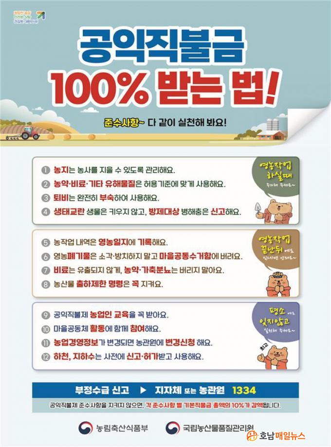 2020³â¿¡ µµÀÔµÈ °øÀÍÁ÷ºÒÁ¦´Â ³ó¾÷․³óÃÌÀÇ °øÀÍÀû ±â´ÉÀ» ÁõÁøÇÏ¸é¼ ³ó¾÷¿¡ Á¾»çÇÏ´Â ³ó¾÷ÀÎÀÇ ¼Òµæ¾ÈÁ¤À» µ½±â À§ÇØ Á÷ºÒ±ÝÀ» Áö¿øÇÏ´Â Á¦µµ´Ù. Á÷ºÒ±ÝÀ» 100% ¹Þ±â À§Çؼ´Â ³ó°¡°¡ ¹ý·É¿¡¼ Á¤ÇÑ 17°¡Áö Àǹ« Áؼö»çÇ×À» ¸ðµÎ ½ÇÃµÇØ¾ß ÇÑ´Ù.