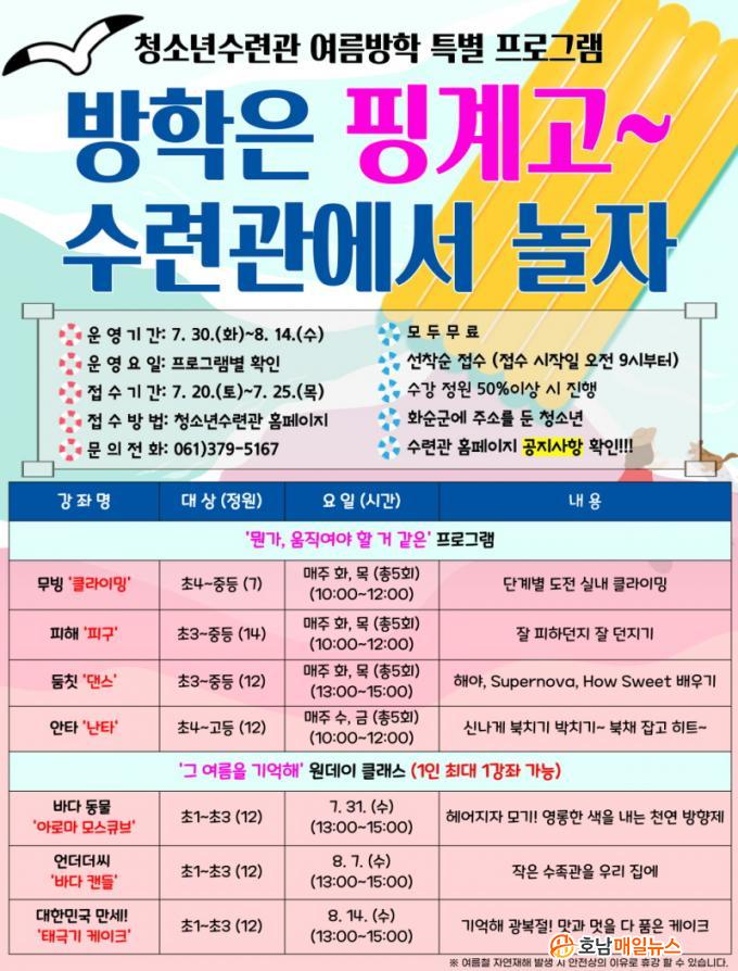 ¿©¸§ ¹æÇÐ ±â°£ÀÎ 7¿ù30ÀÏ(È)~8¿ù14ÀÏ(¼ö)±îÁö ¾à 3ÁÖ µ¿¾È ¸ÅÁÖ ÇØ´ç ¿äÀÏ¿¡ ÁøÇàµÇ´Â 4°³ °ÁÂ¿Í ¼ö¿äÀϸ¶´Ù ÁøÇàµÇ´Â 3°³ ¿øµ¥ÀÌ Å¬·¡½º·Î ´Ù¾çÇÑ È°µ¿°ú üÇèÀ» °æÇèÇÒ ¼ö ÀÖ´Â ½Ã°£À¸·Î ¿î¿µµÈ´Ù.