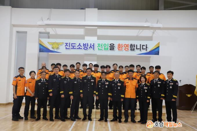 ¹ÚõÁ¶ ¼ÀåÀº "Áøµµ¼Ò¹æ¼·Î ÀüÀÔÇÑ Á÷¿øµéÀ» Áø½ÉÀ¸·Î ȯ¿µÇÑ´Ù"¸ç "°¢ÀÚÀÇ ÀÚ¸®¿¡¼ ±º¹ÎÀÇ ¾ÈÀüÀ» ÁöŰ´Â ¼Ò¹æ°ø¹«¿øÀ¸·Î¼ »ç¸í°¨À» °¡Áö°í ÃÖ¼±À» ´ÙÇØÁֽñ⸦ ¹Ù¶õ´Ù"¶ó°í ÀüÇß´Ù.