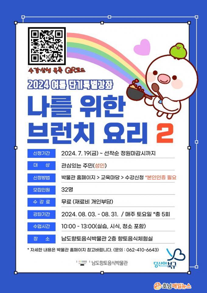 Áö¿ªÁÖ¹Î(¼ºÀÎ) 32¸íÀ» ´ë»óÀ¸·Î ¿¸®´Â À̹ø °Á´ ¿î¿µ ±â°£ Áß ¸ÅÁÖ Åä¿äÀÏ ¿ÀÀü 10½ÃºÎÅÍ ¿ÀÈÄ 1½Ã±îÁö ÃÑ 5ȸ¿¡ °ÉÃÄ ¡®±¤Áֽà ¹«Çü¹®ÈÀç Á¦17È£(³²µµÀÇ·ÊÀ½½ÄÀå)¡¯ À̼öÀÚÀÎ ¡®ÀÓ¿µ¶õ °»ç¡¯ÀÇ ºê·±Ä¡ ¿ä¸® À̷аú ½Ç½À․½Ã½Ä °úÁ¤ÀÌ ¹«·á(Àç·áºñ ¼ö°»ý ºÎ´ã)·Î ÁøÇàµÈ´Ù.