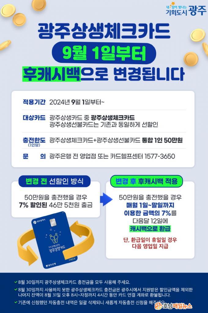 ±¤ÁÖ±¤¿ª½Ã(½ÃÀå °±âÁ¤)´Â ±¤ÁÖ»ó»ýüũīµåÀÇ ÇÒÀÎÁö¿ø¹æ½ÄÀÌ ÃæÀü±Ý¾×ÀÇ 7%¸¦ ÇÒÀÎÇØ ÁÖ´Â ¼± ÇÒÀο¡¼ ÃæÀü±Ý¾×À» »ç¿ëÇÑ ÈÄ 7%¸¦ ȯ±Þ(ij½Ã¹é)ÇØÁÖ´Â ¹æ½ÄÀ¸·Î º¯°æµÈ´Ù°í ¹àÇû´Ù. ´Ù¸¸ ±¤ÁÖ»ó»ý¼±ºÒÄ«µå ÇÒÀιæ½ÄÀº ±âÁ¸°ú µ¿ÀÏÇÏ°Ô ¼± ÇÒÀÎ ¹æ½ÄÀ¸·Î ¿î¿µµÈ´Ù.