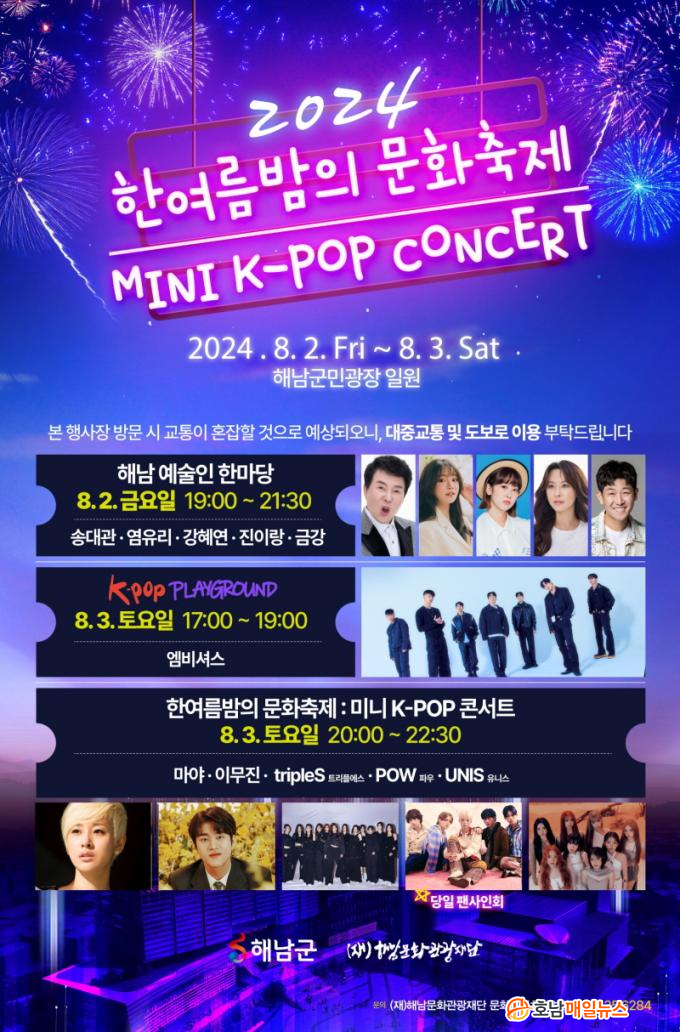 ¿ÃÇØ´Â 2ÀÏ ÇØ³²¿¹¼úÀÎ ÇѸ¶´ç°ú 3ÀÏ K-POP ¹Ì´ÏÄܼƮ·Î ²Ù¸çÁø´Ù. 2ÀÏ ÇØ³²¿¹¼úÀÎ ÇѸ¶´çÀº ¿ÀÈÄ 7½ÃºÎÅÍ ÃÊ´ë°¡¼ö ¼Û´ë°üÀ» ºñ·ÔÇØ ¿°À¯¸®, °Çý¿¬, ÁøÀ̶û, ±Ý° µî Æ®·ÎÆ® °¡¼öµéÀÌ Ã⿬ÇÏ¿© ¿Á¤ÀûÀÎ ¹«´ë¸¦ ¼±º¸ÀδÙ. ¶ÇÇÑ 3ÀÏ¿¡´Â ¿ÀÈÄ 8½ÃºÎÅÍ ¸¶¾ß, À̹«Áø, Æ®¸®Çÿ¡½º, ÆÄ¿ì(POW), À¯´Ï½º(UNIS) µî ½Ç·ÂÆÄ °¡¼öµé°ú ¾ÆÀ̵¹ ½ºÅ¸µéÀÌ Ã⿬ÇÏ´Â ¹Ì´Ï K-POP ÄܼƮÀÇ ¶ß°Å¿î ¿±â·Î ¿©¸§¹ãÀ» ´Þ±¼ ¿¹Á¤ÀÌ´Ù.