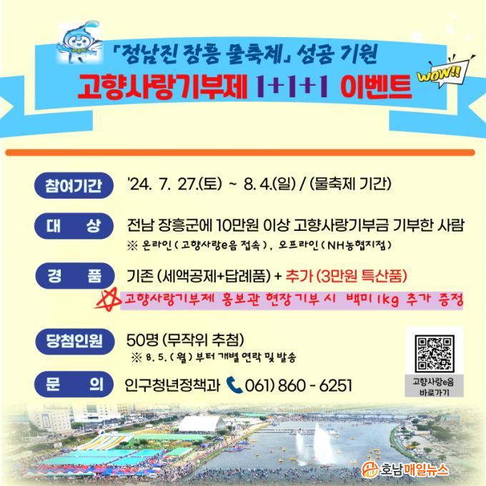 À̹ø Çà»ç´Â ¹°ÃàÁ¦ ±â°£ÀÎ 7¿ù 27ÀϺÎÅÍ 8¿ù 4ÀϱîÁö 9Àϰ£ ÀåÈﱺ¿¡ 10¸¸¿ø ÀÌ»ó °íÇâ»ç¶û±âºÎ¸¦ ÇÑ »ç¶÷µé Áß 50¸í Ãß÷À» ÅëÇØ ±âÁ¸ ¼¼¾×°øÁ¦¿Í ´ä·Êǰ ÇýÅÿ¡ Ãß°¡·Î 3¸¸¿ø »ó´çÀÇ Áö¿ª Ư»êǰÀ» °æÇ°À¸·Î Á¦°øÇÏ´Â 1+1+1À̺¥Æ®´Ù.
