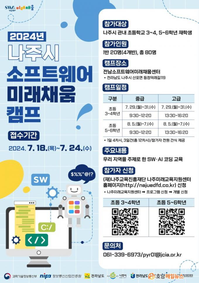 °ü³» ÃʵîÇб³ 3~6Çг⠰¢ 20¸í¾¿ 4°³¹ÝÀ» ±¸¼ºÇÒ ¿¹Á¤À̸ç Àü³² ¼ÒÇÁÆ®¿þ¾î(SW) ¹Ì·¡Ã¤¿ò¼¾ÅÍ(³ªÁֽà »êÆ÷¸é µîÁ¤´ö·Ê±æ 119)¿¡¼ 7¿ù 29ÀϺÎÅÍ 8¿ù 7ÀϱîÁö ÃÑ 8ȸÂ÷·Î ÁøÇàÇÑ´Ù.