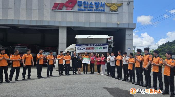 ÀÌ¿¡ ¼Ò¹æº»ºÎ °ü°èÀÚ¿Í ÀÇ¿ë¼Ò¹æ´ë¿øÀÌ Âü¼®ÇÑ °¡¿îµ¥ ¹ÚÁ¾ÇÊ Àü³²µµ ȯ°æ»ê¸²±¹ÀåÀÌ ÀÌÁ¤Çö ¹«¾È¼Ò¹æ¼Àå¿¡°Ô »êºÒ ÁøÈÀåºñ¸¦ Á÷Á¢ Àü´ÞÇß´Ù.