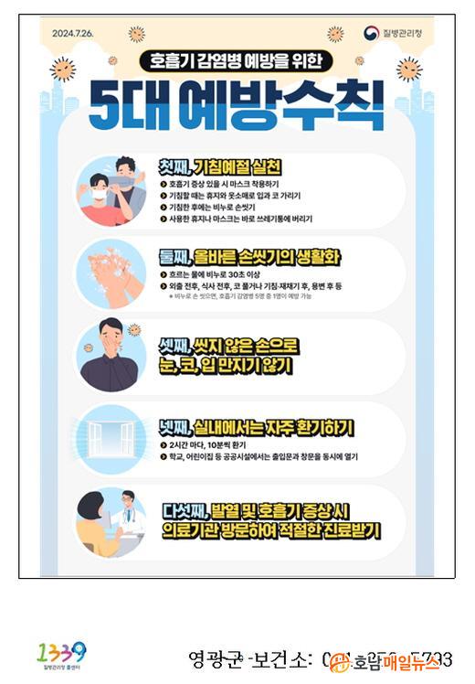 ¿µ±¤±º º¸°Ç¼Ò °ü°èÀÚ´Â ¡°È£Èí±â °¨¿°º´ ¿¹¹æÀ» À§ÇØ ±âħÇÒ ¶§ ÈÞÁö³ª ¿Ê¼Ò¸Å·Î ÀÔ°ú ÄÚ¸¦ °¡¸®°í ±âħÇÏ´Â ±âħ¿¹Àý°ú, ¿Ã¹Ù¸¥ ¼Õ¾Ä±â »ýȰÈ, ¾ÄÁö ¾Ê´Â ¼ÕÀ¸·Î ´«, ÄÚ, ÀÔ ¸¸ÁöÁö ¾Ê±â, ½Ç³»¿¡¼ ÀÚÁÖ È¯±âÇϱâ, ¹ß¿ ¹× È£Èí±â Áõ»óÀÌ ÀÖÀ» ½Ã ÀÇ·á±â°ü ¹æ¹®ÇÏ¿© ÀûÀýÇÑ Áø·á ¹Þ±â µî ¿¹¹æ¼öÄ¢ÁؼöÀÇ »ýȰȸ¦ ´çºÎÇÑ´Ù°í ¡±°í ¹àÇû´Ù.