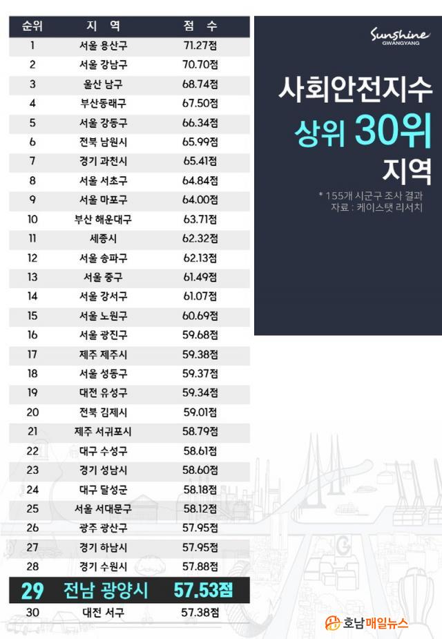 ±âÃÊÁöÀÚü Áß Ç¥º»ÀÇ ¼ýÀÚ°¡ ÀûÀº °÷À» Á¦¿ÜÇÑ Àü±¹ 155°³ ÁöÀÚü¿¡¼ ±¤¾ç½Ã´Â 29À§·Î Àü³²¿¡¼ À¯ÀÏÇÏ°Ô »óÀ§ 30À§±Ç¿¡ Æ÷ÇԵǾúÀ¸¸ç, Ưº°½Ã¡¤±¤¿ª½Ã ¼ÒÀçÁö¸¦ Á¦¿ÜÇÑ ½Ã.±º.±¸ Áß¿¡´Â 10À§¿¡ À̸§À» ¿Ã·È´Ù.
