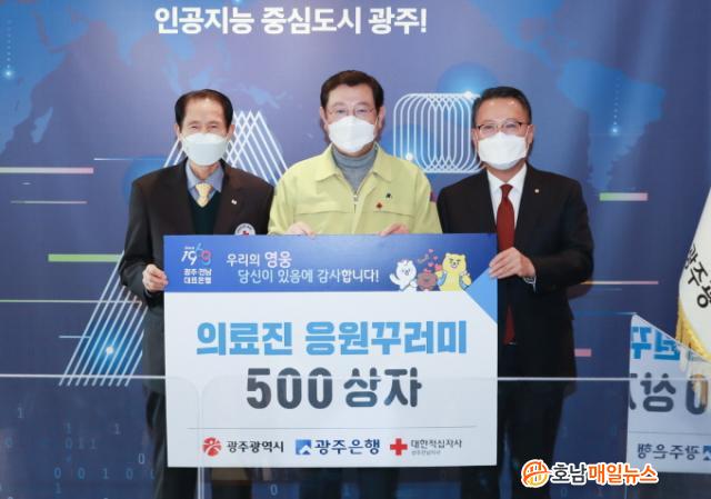 ¸ÕÀú ±¤ÁÖÀºÇàÀº Äڷγª19¿¡ ´ëÀÀÇϱâ À§ÇØ ÃÖÀϼ±¿¡¼ »ç¸í°¨À» °®°í Çå½ÅÇϰí ÀÖ´Â ÀÇ·áÁøÀ» ÀÀ¿øÇϱâ À§ÇØ 2500¸¸¿ø »ó´çÀÇ ÀÇ·áÁø ÀÀ¿ø²Ù·¯¹Ì 500°³¸¦ Àû½ÊÀڻ籤ÁÖÀü³²º»ºÎ¿¡ Àü´ÞÇß´Ù.