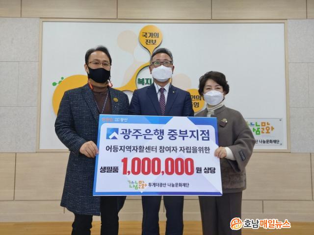 [È£³²¸ÅÀÏ´º½º = ÀÌÁ¾¹é ±âÀÚ] ±¤ÁÖÀºÇà ÁߺÎÁöÁ¡(ÁöÁ¡Àå ¹Ú³²±Ô)ÀÌ 15ÀÏ ±¤»ê±¸ ÀÚȰ Âü¿©ÀÚµéÀ» ÀÀ¿øÇÏ¸ç ¾îµîÁö¿ªÀÚȰ¼¾ÅÍ¿¡ 100¸¸¿ø »ó´çÀÇ »ýÇÊǰ ¼±¹° ¼¼Æ®¸¦ ±âºÎÇß´Ù.
