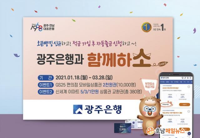 ¡ã¡®¿ÀÇÂÇϼҡ¯ À̺¥Æ®´Â ±¤ÁÖÀºÇà ¿ÀǹðÅ· ¼ºñ½º ½Å±Ô °¡ÀÔ ÈÄ ´Ù¸¥ ±ÝÀ¶±â°ü °èÁ¿¡¼ ±¤ÁÖÀºÇà º»ÀÎ °èÁ·Π1¸¸¿ø ÀÌ»ó ÀÌüÇÑ °í°´À» ´ë»óÀ¸·Î Çϸç, ¼±Âø¼ø 10,000¸í¿¡°Ô GS25ÆíÀÇÁ¡ ¸ð¹ÙÀÏ»óǰ±Ç 2õ¿ø±ÇÀ» Á¦°øÇÑ´Ù.
