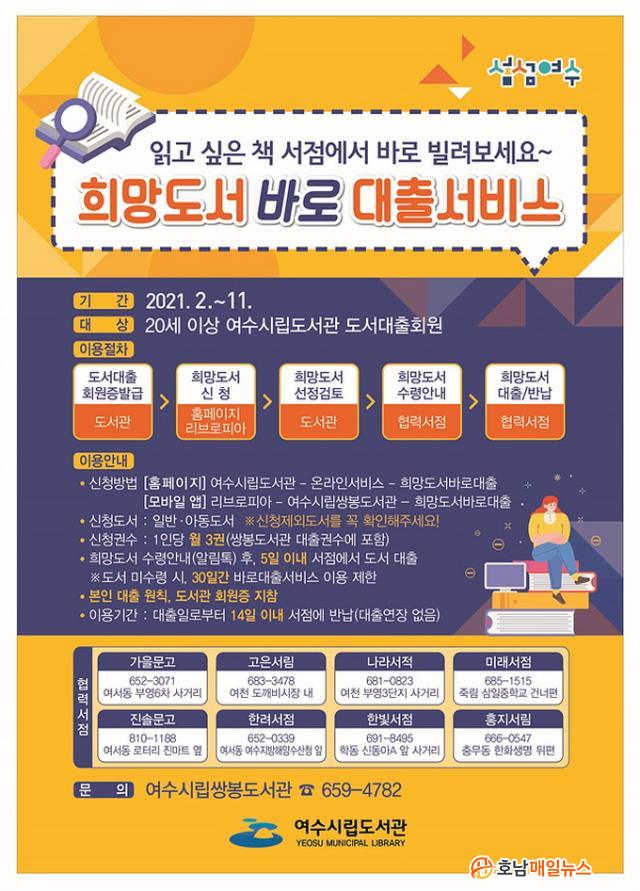 µµ¼ ½ÅûÀº ¿©¼ö½Ã¸³µµ¼°ü ȨÆäÀÌÁö(yslib.yeosu.go.kr) ¶Ç´Â ¸ð¹ÙÀÏ ¾Û(¸®ºê·ÎÇǾÆ)À» ÅëÇØ ÇÏ¸é µÈ´Ù. ½Åû µµ¼´Â īī¿ÀÅåÀ¸·Î ¼ö·É ¾È³»¸¦ ¹ÞÀº ÈÄ, µµ¼´ëÃâȸ¿øÁõÀ» ÁöÂüÇϰí ÁöÁ¤¼Á¡¿¡¼ ´ëÃâ‧¹Ý³³ÇÏ¸é µÈ´Ù.