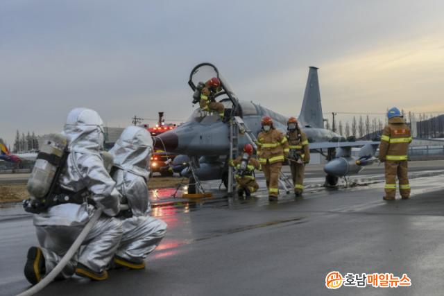 À̳¯ ÈÆ·ÃÀº F-5 Ç×°ø±â°¡ Âø·ú Áß È°Áַθ¦ ÀÌÅ»Çϸç ÈÀç°¡ ¹ß»ýÇÏ´Â »óȲÀ» °¡Á¤ÇÏ¿© ½ÃÀ۵Ǿú´Ù. Ç×°ø±âÀÇ ºñ»ó»óȲÀ» Á¢¼öÇÑ ¼Ò¹æÁß´ë´Â Áï½Ã ¼Ò¹æÂ÷·® 4´ë¿Í ¼Ò¹æ¿ä¿ø 17¸íÀ» Ã⵿½ÃÄ×´Ù.