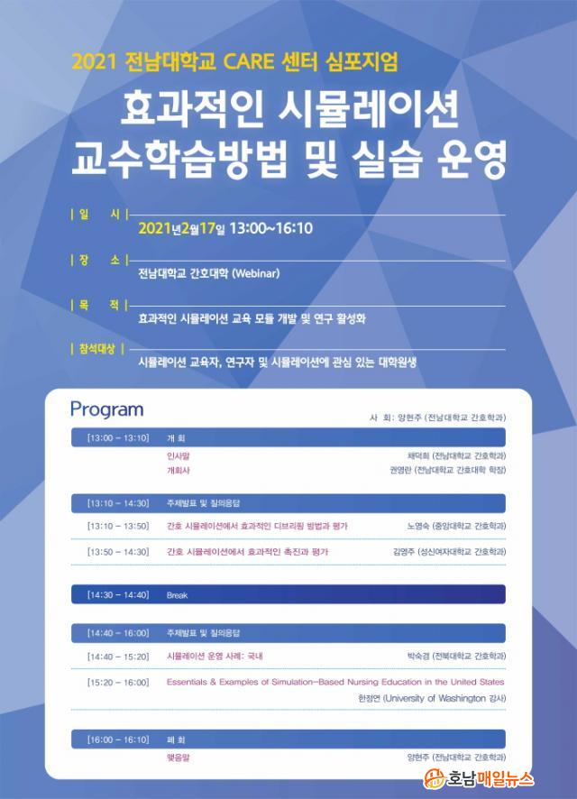 Àü³²´ë °£È£´ëÇÐ(ÇÐÀå ±Ç¿µ¶õ ±³¼ö)Àº ¿À´Â 2¿ù 17ÀÏ ¡®È¿°úÀûÀÎ ½Ã¹Ä·¹ÀÌ¼Ç ±³¼öÇнÀ¹æ¹ý ¹× ½Ç½À ¿î¿µ¡¯À̶ó´Â ÁÖÁ¦·Î ¡¸2021 Àü³²´ëÇб³ CARE CENTER ½ÉÆ÷Áö¾ö¡¹À» °³ÃÖÇÑ´Ù.