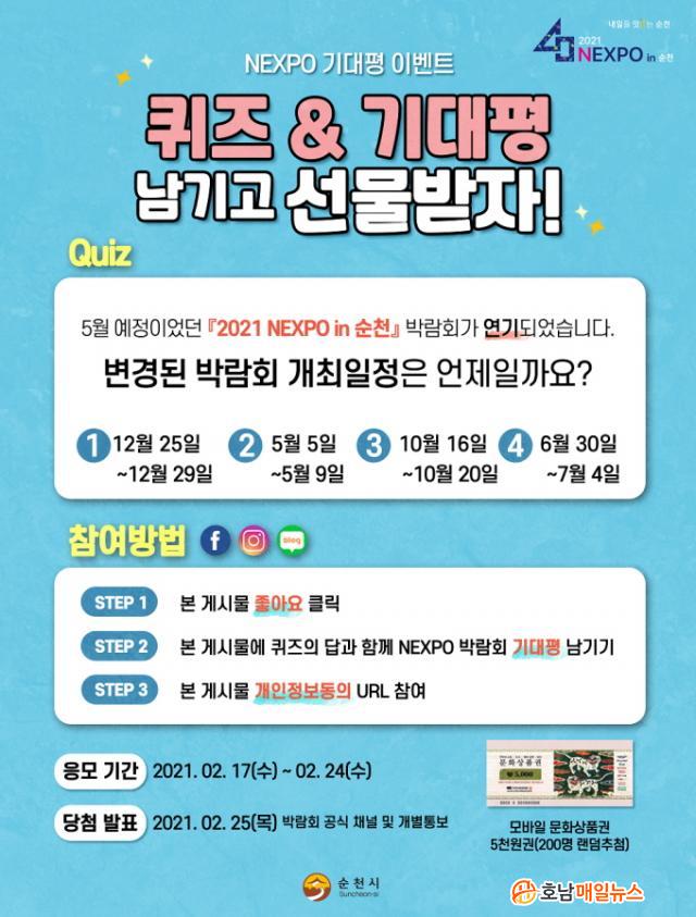 ¡®2021 NEXPO in ¼øÃµ ÄûÁî&±â´ëÆò ³²±â°í ¼±¹°¹ÞÀÚ!¡¯À̺¥Æ®´Â ¹Ú¶÷ȸ °ø½Ä SNS ä³Î(ºí·Î±×¡¤ÆäÀ̽ººÏ¡¤ÀνºÅ¸±×·¥)À» ÅëÇØ 2¿ù 17ÀϺÎÅÍ 24ÀϱîÁö ÁøÇàµÈ´Ù.