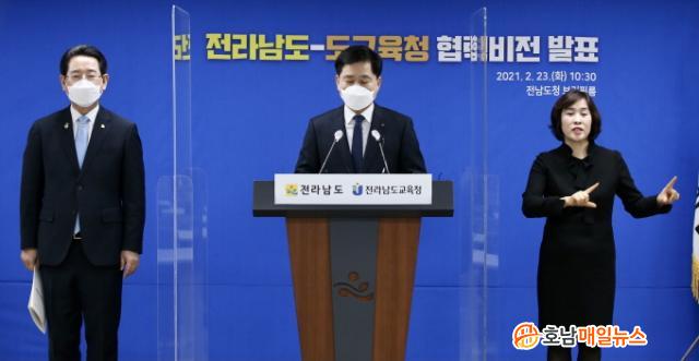 À̳¯ Àü³²µµÃ» ºê¸®Çη뿡¼ °¡Áø °øµ¿¹ßÇ¥¿¡¼ ±è¿µ·Ï Àü¶ó³²µµÁö»ç¿Í Àå¼®¿õ Àü¶ó³²µµ±³À°°¨Àº ½ÅÇб⠵¸¦ ¾ÕµÎ°í Äڷγª19 À§±â·ÎºÎÅÍ µµ¹Î°ú ÇлýÀÌ ¾È½ÉÇÒ ¼ö ÀÖ´Â ±³À°È¯°æÀ» ¸¸µé±â À§ÇØ °øµ¿ ³ë·ÂŰ·Î ´ÙÁüÇß´Ù.