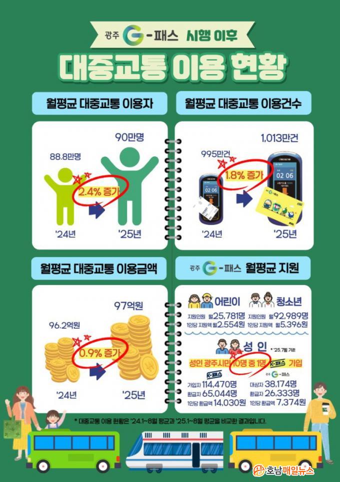 ¡®±¤ÁÖG-ÆÐ½º¡¯¿Í ¿¬°èµÈ ¡®K-ÆÐ½º¡¯ÀÇ Áö¿ª °¡ÀÔÀÚµµ ´ëÆø ´Ã¾ú´Ù. ±¤ÁÖÁö¿ª K-ÆÐ½º °¡ÀÔÀÚ´Â 2024³â ¸» 4¸¸5749¸í¿¡¼ 2025³â 8¿ù ¸» 11¸¸4470¸íÀ¸·Î 8°³¿ù ¸¸¿¡ 6¸¸8721¸í, 2.5¹è Áõ°¡Çß´Ù. ¿ÃÇØ 7¿ù ±âÁØ 15ȸ ÀÌ»ó ´ëÁß±³ÅëÀ» ÀÌ¿ëÇØ ȯ±ÞÀ» ¹ÞÀº ½Ã¹ÎÀº 6¸¸5044¸íÀ̸ç, 1ÀÎ´ç ¿ùÆò±Õ 1¸¸4030¿øÀ» µ¹·Á¹Þ¾Ò´Ù.