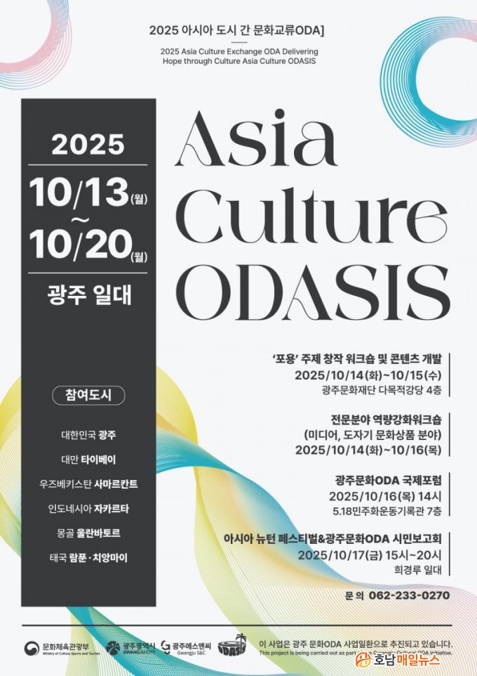 ¡®±¤ÁÖÇü ¹®È­ °øÀû°³¹ß¿øÁ¶(ODA)-¾Æ½Ã¾Æ ÄÃÃÄ ¿À´Ù½Ã½º(Asia Culture ODASIS)¡¯´Â ±¤ÁÖ¸¦ Áß½ÉÀ¸·Î ¡ã¸ù°ñ ¿ï¶õ¹ÙÅ丣 ¡ãÀεµ³×½Ã¾Æ ÀÚÄ«¸£Å¸ ¡ãű¹ ¶÷Ǭ¡¤Ä¡¾Ó¸¶ÀÌ ¡ã¿ìÁŰ½ºÅº »ç¸¶¸£Ä­Æ® ¡ã´ë¸¸ âȭ µî ¾Æ½Ã¾Æ 6°³±¹ 7°³ µµ½ÃÀÇ Ã»³â¿¹¼ú°¡ 70¿© ¸íÀÌ Âü¿©ÇÏ´Â ±¹Á¦ ¹®È­¿¹¼ú Çù·Â»ç¾÷ÀÌ´Ù. À̵éÀº µµ½ÃÀç»ý, Áö¿ª Ưȭ ¹®È­»óǰ °³¹ß, ¹Ìµð¾î¾ÆÆ® µî ´Ù¾çÇÑ Çù¾÷ÇÁ·ÎÁ§Æ®¸¦ ÃßÁøÇß´Ù.