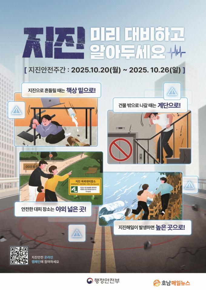 ÁöÁø¾ÈÀüÁÖ°£Àº 2016³â °æÁÖ ÁöÁø(±Ô¸ð 5.8)À» °è±â·Î ±¹°¡ÀûÀ¸·Î ÁöÁ¤µÈ ¹ü±¹¹Î ¾ÈÀü Ä·ÆäÀÎ ±â°£ÀÌ´Ù. ±¤Áֽô ¿ÃÇØ ¡®ÁöÁø, Èçµé¸± ¶§´Â ŹÀÚ ¹Ø! ³ª°¥ ¶§´Â °è´Ü!¡¯À» ½½·Î°ÇÀ¸·Î Á¤Çϰí, ½Ã¹ÎÀÌ ÀÏ»ó ¼Ó¿¡¼ ½ÇõÇÒ ¼ö ÀÖ´Â ¾ÈÀü¹®È È®»ê¿¡ ÁÖ·ÂÇÑ´Ù.