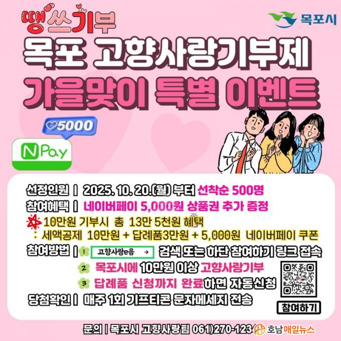 À̹ø À̺¥Æ®´Â 10¿ù 20ÀϺÎÅÍ °íÇâ»ç¶û±âºÎÁ¦¸¦ ÅëÇØ ¸ñÆ÷½Ã¿¡ 10¸¸ ¿ø ÀÌ»ó ±âºÎÇÏ°í ´ä·ÊǰÀ» ½ÅûÇÑ ±âºÎÀÚ¸¦ ´ë»óÀ¸·Î Çϸç, º°µµÀÇ ÀÀ¸ð ÀýÂ÷ ¾øÀÌ ÀÚµ¿ Âü¿©µÈ´Ù. ¼±Âø¼ø 500¸í¿¡°Ô ³×À̹öÆäÀÌ Æ÷ÀÎÆ® 5,000¿ø ÄíÆùÀÌ Áö±ÞµÈ´Ù.