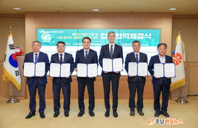 À̳¯ Çù¾à½Ä¿¡´Â ±è¿µ¹® ±¤Áֽù®È°æÁ¦ºÎ½ÃÀåÀ» ºñ·ÔÇØ Áö¿ª 4°³ ¿¬±¸±â°ü °ü°èÀÚ ¹× ÇÁ·©Å© ¸¶ÀÌŬ ÁÖÆ®³Ê TUV¶óÀζõµåÄÚ¸®¾Æ¢ß ´ëÇ¥ µîÀÌ Âü¼®Çß´Ù. À̹ø Çù¾àÀº Áö¿ª ¹èÅ͸® »ê¾÷ÀÇ ÇØ¿Ü ÁøÃâÀ» ÃËÁøÇϰí, ±¹Á¦ ÀÎÁõ ÀýÂ÷¿¡ ÇÊ¿äÇÑ ½ÃÇ衤Æò°¡¸¦ Áö¿ª ³»¿¡¼ ¼öÇàÇÒ ¼ö ÀÖµµ·Ï Çϱâ À§ÇÑ °ÍÀÌ´Ù.