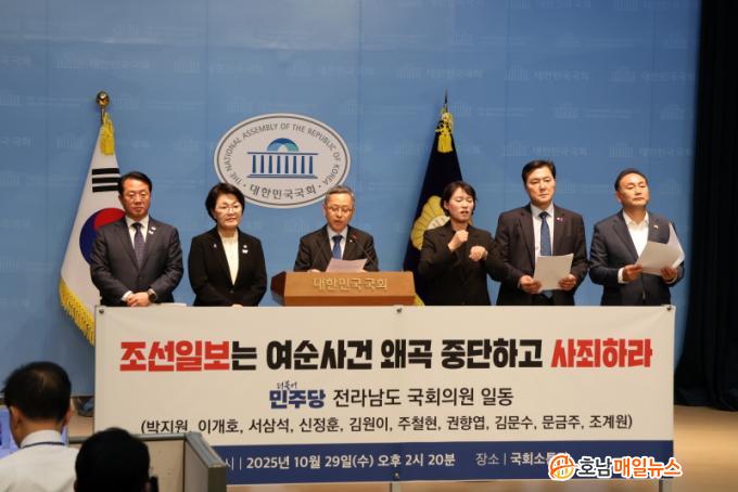 Àü³² Áö¿ª ¹ÎÁÖ´ç ÀÇ¿øµéÀº 29ÀÏ ±¹È¸ ¼ÒÅë°ü¿¡¼ ±âÀÚȸ°ßÀ» ¿°í ¡°Á¶¼±ÀϺ¸°¡ ¿©¼ø»ç°Ç 77Áֱ⸦ ¸Â¾Æ ´ëÅë·ÉÀÇ Ã߸ð ¸Þ½ÃÁö¸¦ ¿Ö°îÇϰí, Èñ»ýÀÚ¿Í À¯Á·ÀÇ ¸í¿¹¸¦ Áþ¹â¾Ò´Ù¡±°í ºñÆÇÇß´Ù.
