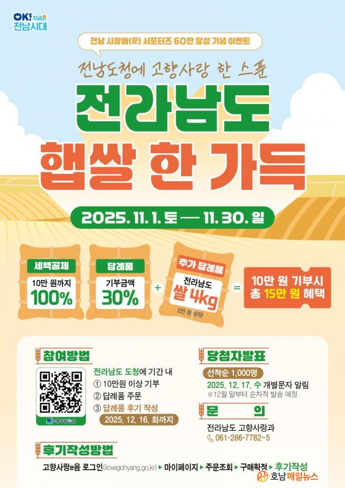À̺¥Æ®´Â °íÇâ¿¡ »ç¶ûÀ» ³ª´©°í, Áö¿ª ³ó°¡¸¦ ÀÀ¿øÇÏ´Â ºÐÀ§±â È®»êÀ» À§ÇØ ¸¶·ÃµÆ´Ù. 11¿ù 1ÀϺÎÅÍ 30ÀϱîÁö Àü³²µµÃ»¿¡ 10¸¸ ¿ø ÀÌ»óÀ» ±âºÎÇÏ°í ´ä·Êǰ Èı⸦ ÀÛ¼ºÇÑ ¼±Âø¼ø 1õ ¸í¿¡°Ô Àü³² ÇÝ½Ò 4kgÀ» Ãß°¡·Î ÁõÁ¤ÇÑ´Ù.