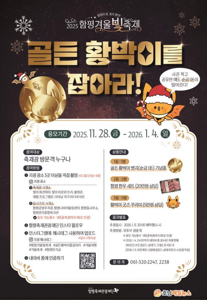 ÇÔÆòÃàÁ¦°ü±¤Àç´ÜÀº °Ü¿ïºûÃàÁ¦¸¦ ã´Â °ü±¤°´µé¿¡°Ô »ö´Ù¸¥ Àç¹Ì¸¦ Á¦°øÇϱâ À§ÇØ »çȸ°ü°è¸Á¼ºñ½º(SNS) Âü¿©Çü À̺¥Æ® ¡®°ñµç Ȳ¹ÚÀ̸¦ Àâ¾Æ¶ó!¡¯¸¦ ³»³â 1¿ù 4ÀÏ 24½Ã±îÁö ÁøÇàÇÑ´Ù°í 27ÀÏ ¹àÇû´Ù. Çà»ç´Â Ãß÷ÀÇ °øÁ¤¼ºÀ» À§ÇØ ÀνºÅ¸±×·¥¿¡¼¸¸ Âü¿©ÇÒ ¼ö ÀÖ´Ù.
