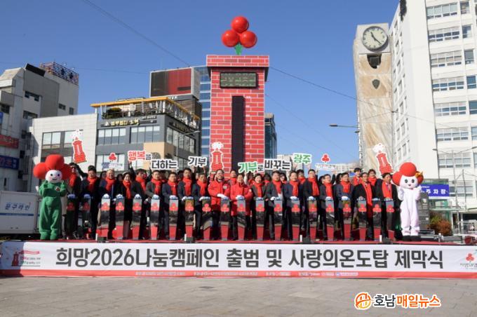 ¿ÃÇØ Ä·ÆäÀÎ ÁÖÁ¦´Â ¡®ÇູÀ» ´õÇÏ´Â ±âºÎ, ±âºÎ·Î ¹Ù²Ù´Â ±¤ÁÖ¡¯·Î, ¸ð±Ý ¸ñÇ¥¾×Àº 51¾ï2000¸¸¿øÀÌ´Ù. ¸ñÇ¥¾×ÀÇ 1%°¡ ¸ð±ÝµÉ ¶§¸¶´Ù 5¡¤18¹ÎÁÖ±¤Àå¿¡ ¼³Ä¡µÈ »ç¶ûÀÇ ¿ÂµµÅ¾ ¼öÀºÁÖ°¡ 1µµ¾¿ ¿À¸¥´Ù. ¸ñÇ¥¾×ÀÌ ´Þ¼ºµÇ¸é »ç¶ûÀÇ ¿ÂµµÅ¾ 100µµ¸¦ ´Þ¼ºÇÑ´Ù.