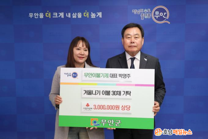 Áö³ 2ÀÏ ¹«¾È±ºÃ»¿¡¼ ¿¸° ±âŹ½Ä¿¡´Â ¡ã¹«¾ÈÀ̺Ò(´ëÇ¥ ¹Ú¿µÁÖ) ÀÌºÒ 30ä ¡ã¹«¾È±º 4-H¿¬ÇÕȸ¡¤¹«¾È±º»õ¸¶À»Ã»³â¿¬´ë(ȸÀå ¼ÛÈ¿Âù) ½Ò 1,000kg ¹× ±èÄ¡ 50¹Ú½º, ¿©¼º¿ëǰ µîÀÌ Àü´ÞµÇ¸ç, Áö¿ª»çȸ¿¡ ÈÆÈÆÇÑ ¿Â±â ³ª´®ÀÇ Á¤À» ´õÇß´Ù.