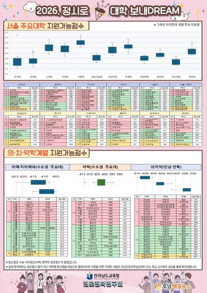 À̹ø ¹èġǥ¿¡´Â ¼öµµ±Ç°ú Àü¶ó±Ç ÀÇ¡¤Ä¡¡¤¾àÇаè¿, ¼¿ï ÁÖ¿ä ´ëÇÐ, Àü³²´ëÇÐÀÇ Áö¿ø °¡´É Á¡¼ö°¡ ÇÔ²² Á¦½ÃµÆ´Ù. ´Ù¸¸, Á¤½ÃÀüÇü¿¡¼ ´ëÇеéÀº ´Ü¼øÇÑ Ç¥ÁØÁ¡¼ö³ª ¹éºÐÀ§ ÇÕÀÌ ¾Æ´Ñ, ¿µ¿ªº° ¹Ý¿µ ºñÀ², °¡»êÁ¡, µî±Þ ȯ»ê ¹æ½Ä µîÀ» Àû¿ëÇÑ ´ëÇк° ȯ»êÁ¡¼ö¸¦ Ȱ¿ëÇØ ÇлýÀ» ¼±¹ßÇÑ´Ù. µû¶ó¼ µ¿ÀÏÇÑ Ç¥ÁØÁ¡¼ö¶óµµ ´ëÇÐ ¹× ¸ðÁý ´ÜÀ§¿¡ µû¶ó ½ÇÁ¦ ¹Ý¿µ Á¡¼ö¿Í Áö¿ø °¡´É¼º¿¡´Â Â÷À̰¡ ¹ß»ýÇÒ ¼ö ÀÖ´Ù.