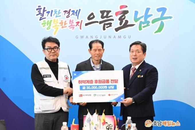 [È£³²¸ÅÀÏ´º½º = ±è¿¬Èñ ±âÀÚ] ¢ß·°Å°»ê¾÷ ¹ÚÈï¼® ȸÀåÀº ´ëÇÑÀû½ÊÀÚ»ç ±¤ÁÖÀü³²Áö»ç¿Í ¿¬°èÇÏ¿© 30ÀÏ ±¤Áֽà ³²±¸Ã»À» ¹æ¹®, °ü³» Ãë¾à°èÃþ Áö¿øÀ» À§ÇÑ ±âºÎ±Ý ¹× »ýÇÊǰ¼¼Æ® µî ÃÑ 3,000¸¸¿ø »ó´çÀ» ³²±¸¿¡ Àü´ÞÇß´Ù.