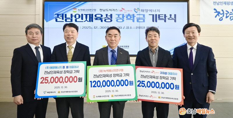 [È£³²¸ÅÀÏ´º½º = ±è¿¬Èñ ±âÀÚ] Àü¶ó³²µµ´Â 30ÀÏ ÀÎÀçÀ°¼º ÀåÇбÝÀ¸·Î (Àç)³ì»ö¿¡³ÊÁö¿¬±¸¿øÀÌ 1¾ï 2õ¸¸ ¿ø, Àü³²µµ½Ã°¡½º(ÁÖ)°¡ 2õ500¸¸¿ø, ¢ßÇØ¾ç¿¡³ÊÁö°¡ 2õ500¸¸ ¿øÀ» Àü³²ÀÎÀçÆò»ý±³À°ÁøÈï¿ø¿¡ ±âŹÇß´Ù°í ¹àÇû´Ù.