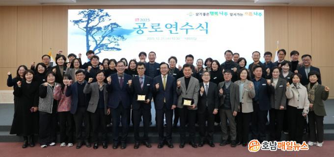 Çà»ç¿¡´Â À±º´Å ³ªÁÖ½ÃÀåÀ» ºñ·ÔÇÑ °£ºÎ °ø¹«¿ø°ú Á÷¿ø µî 150¿© ¸íÀÌ Âü¼®ÇÑ °¡¿îµ¥ 1ºÎ Á¾¹«½Ä°ú 2ºÎ °ø·Î¿¬¼ö½Ä ¼øÀ¸·Î ÁøÇàµÆ´Ù. 1ºÎ Á¾¹«½Ä¿¡¼´Â 2025³â ÇÑ ÇØ µ¿¾È ½ÃÁ¤ ¹ßÀü°ú ½Ã¹Î º¹Áö ÁõÁø¿¡ ±â¿©ÇÑ ½Ã¹Î°ú ±â°ü, °ø¹«¿ø µî 20¸í¿¡°Ô Á¤ºÎ¿Í Àü¶ó³²µµ, ³ªÁֽà ǥâÀÌ ¼ö¿©µÆ´Ù.