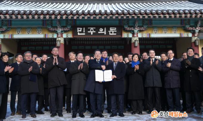 ÀÌ¿¡ µû¶ó ¾ç ½Ã‧µµ´Â À̹ø °øµ¿¼±¾ðÀ» ÅëÇØ ±¤ÁÖ‧Àü³² ÇàÁ¤ÅëÇÕÀ» ´õ ÀÌ»ó ¹Ì·çÁö ¾Ê°í Áï°¢ ÃßÁøÇϱâ·Î ÇÕÀÇÇß´Ù.