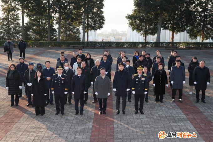 À̳¯ Çà»ç¿¡´Â Á¤ÀÎÈ ±¤¾ç½ÃÀå, ±èÅÂ±Õ Àü¶ó³²µµÀÇÀå, ÃÖ´ë¿ø ±¤¾ç½ÃÀÇÀå, µµ¡¤½ÃÀÇ¿ø, ±â°ü¡¤»çȸ´ÜüÀå, ½Ã °£ºÎ °ø¹«¿ø µî 60¿© ¸íÀÌ Âü¼®ÇØ, ³ª¶ó¸¦ À§ÇØ Çå½ÅÇϰí Èñ»ýÇÑ È£±¹¿µ·É°ú ¼ø±¹¼±¿ÀÇ ¼þ°íÇÑ ¶æÀ» ±â¸®¸ç »õÇØ¸¦ ÇâÇÑ °¢¿À¸¦ ´ÙÁ³´Ù.