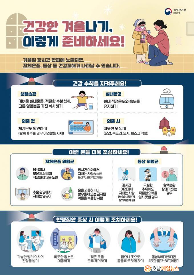 ¿ÜÃ⠽ÿ¡´Â ¿ÊÀ» °ãÃÄ ÀÔ°í Àå°©°ú ¸ñµµ¸®, ¸ðÀÚ µîÀ» Âø¿ëÇØ ü¿ÂÀ» À¯ÁöÇØ¾ß ÇÏ¸ç ½Ç³»¿¡¼´Â ÀûÁ¤½Ç³»¿Âµµ À¯Áö¿Í °¡º¿î ½Ç³»¿îµ¿, ÃæºÐÇÑ ¼öºÐ ¼·Ãë µî ±âº»ÀûÀÎ °Ç°°ü¸®°¡ Áß¿äÇÏ´Ù. ¶ÇÇÑ °Ü¿ïö ºùÆÇ±æ¿¡¼´Â ³«»ó »ç°í À§ÇèÀÌ ³ôÀº ¸¸Å º¸Çà ½Ã °¢º°ÇÑ ÁÖÀǰ¡ ¿ä±¸µÈ´Ù.